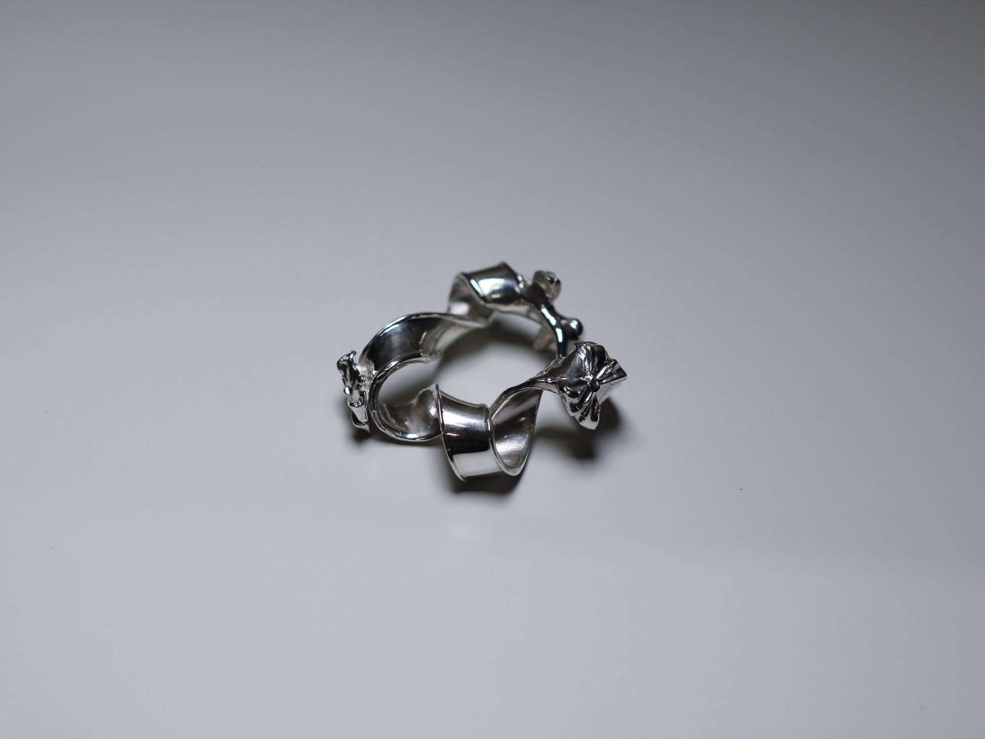 Handmade and designed here in NYC. The Anadem Ring is a holding ring featuring an organic ribbon shape with bows.