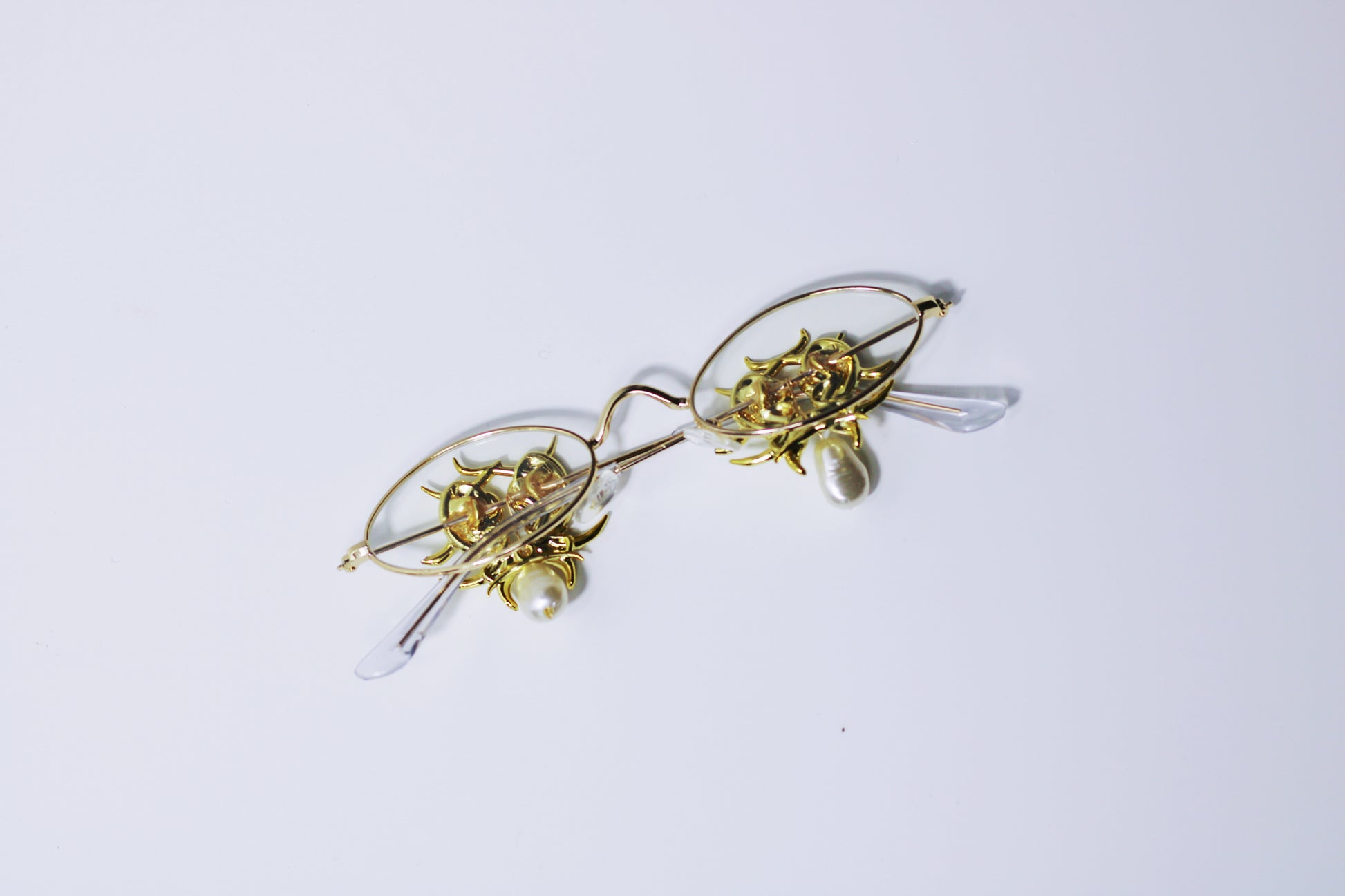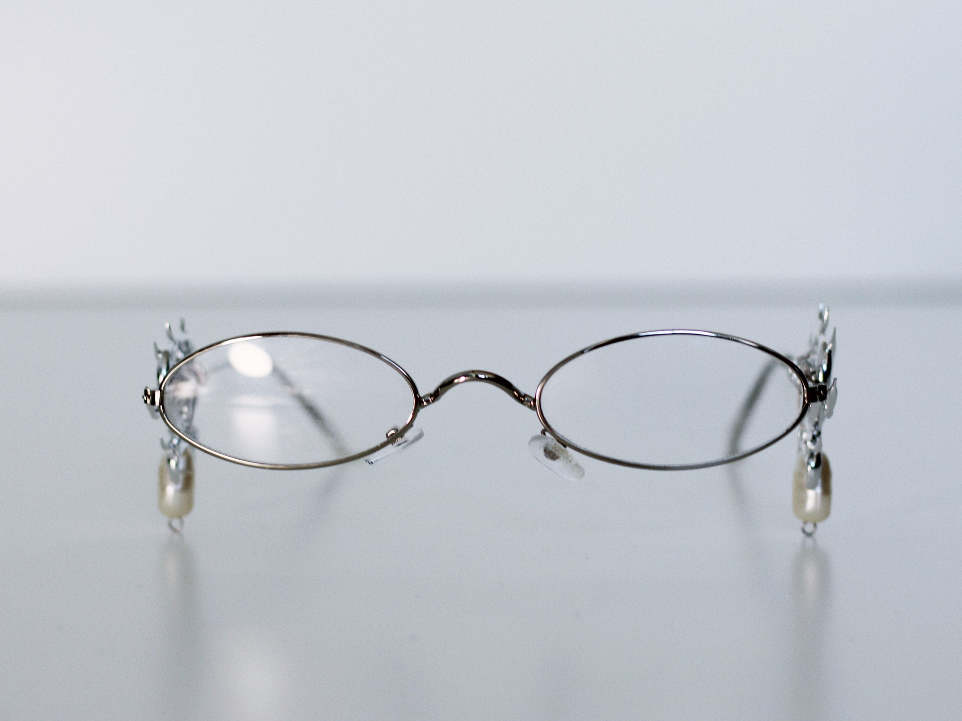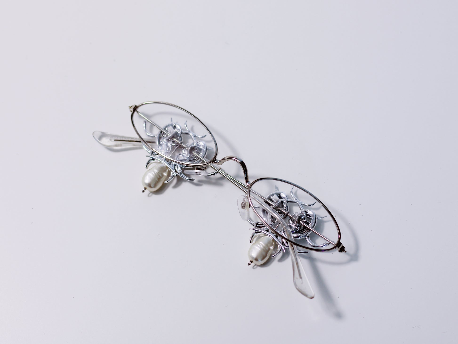 Platinum glasses with clear lens. Temples- 3d printed resin with electro plated silver coating and synthetic pearl. Non prescription.